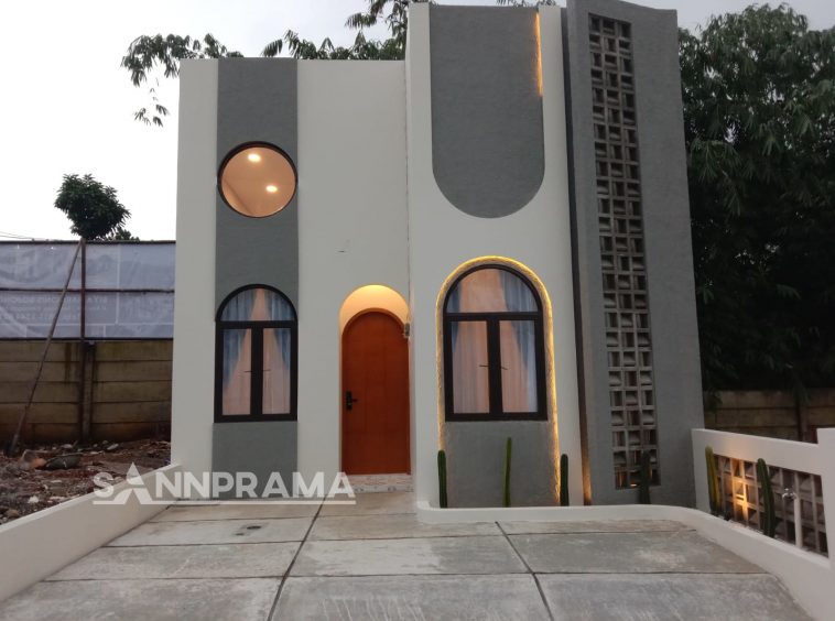 Rumah Desain Santorini Yunani Dekat Stasiun Bojong Gede 495 jt an Type Rumah : – Type Standard LB 38m² – Type Hoek 45m² Optional + (type mezanine) *Spesifikasi :* LB...